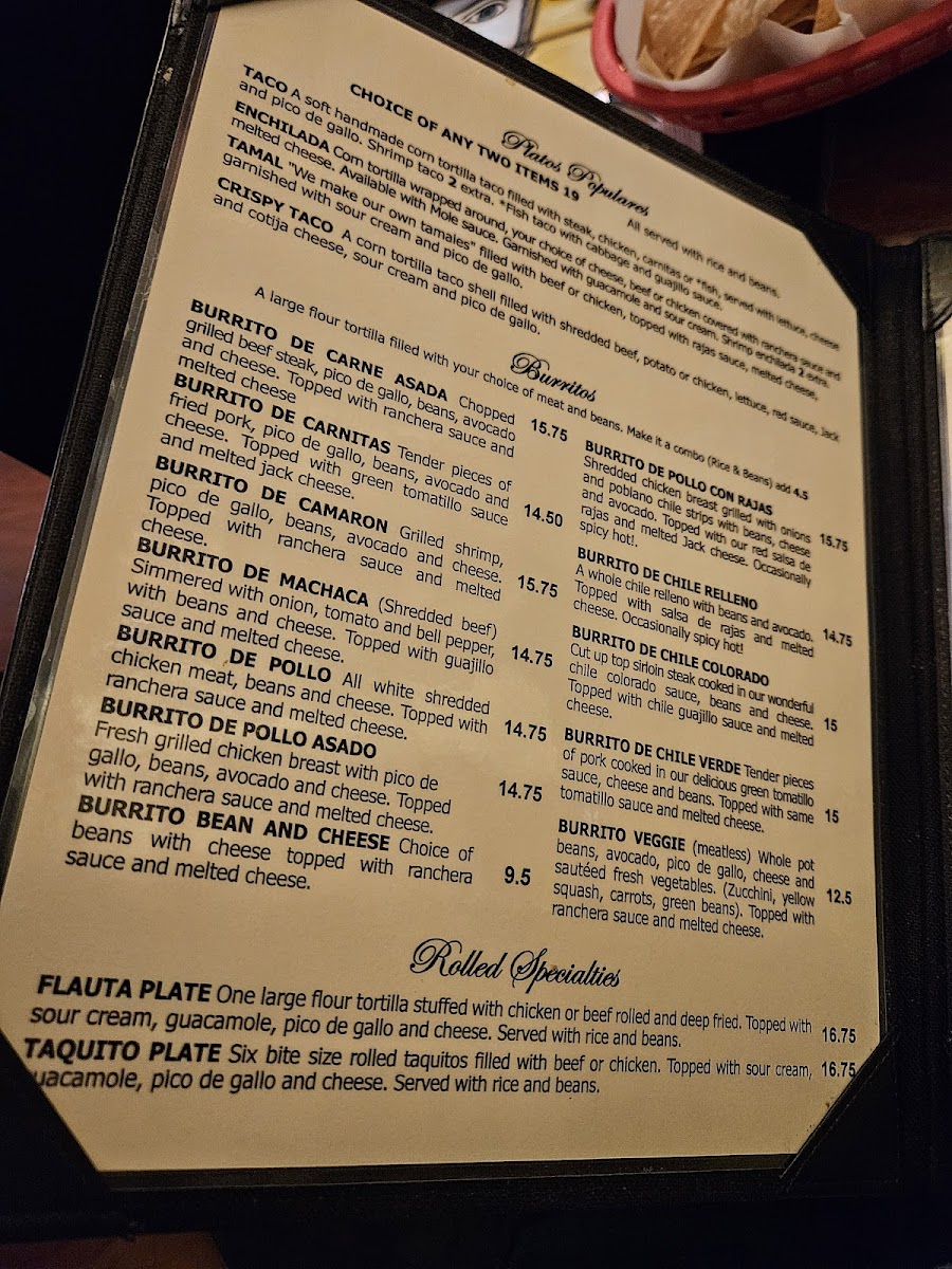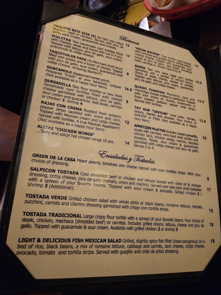 The menu is rich with choices that highlight the best of Mexican culinary traditions. Start your meal with their Sopa De Albondigas, a comforting meatball soup loaded with fresh vegetables, or enjoy the Consome De Pollo, a traditional chicken soup brimming with flavors from daily-prepared broth, tender shredded chicken, and garnished with fresh avocado and cilantro. For something special, the Green Corn Tamale Plate features a sweet corn tamale enhanced with strips of green poblano chile, creamy cheese, and sour cream, served alongside black beans and fried plantains. It's a dish that radiates warmth and satisfaction, perfect for food lovers!